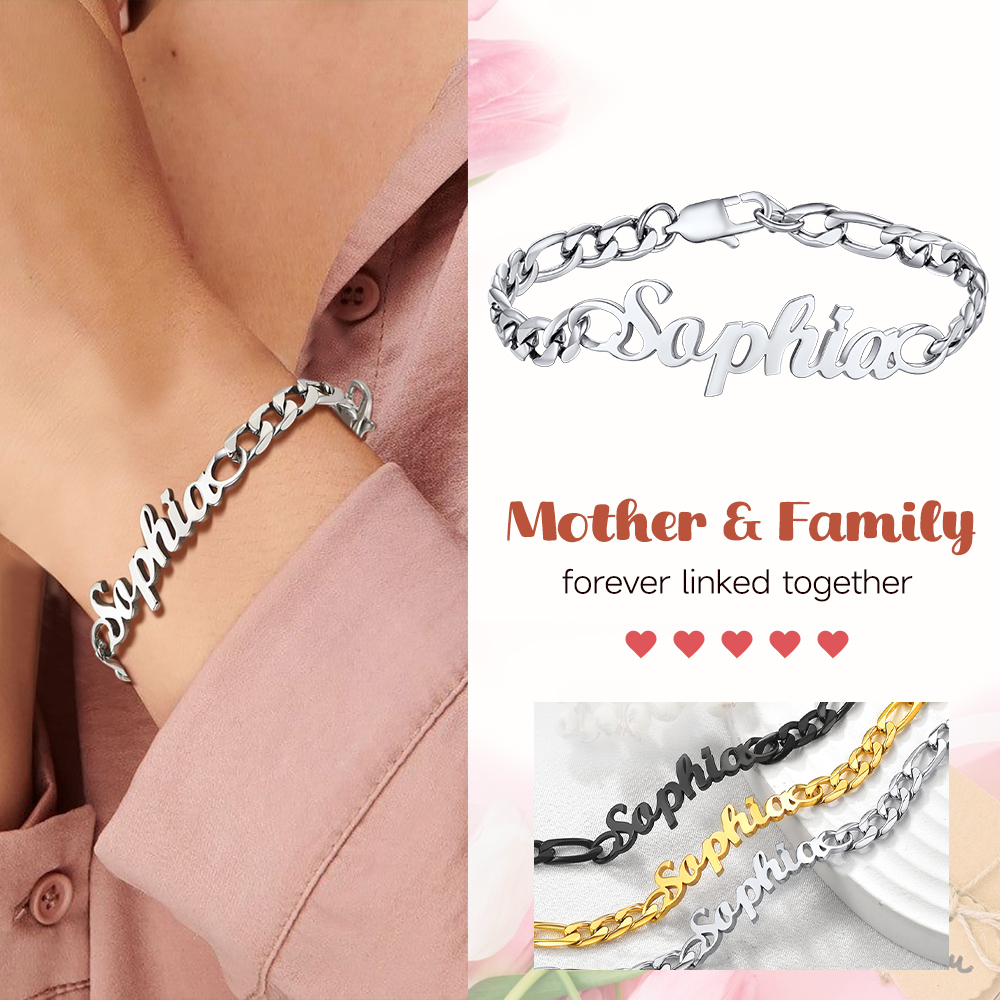Custom Name, date, number, symbols or locations on this name bracelet, makes it unique and meaningful. It can make your outfit more cooler and eye-catching. Perfect size fits wrist well, durable and nice Figaro chain, not Easy to break. Highly polished finish, well made and fine details, shiny and smooth surface, comfortable daily wearing.