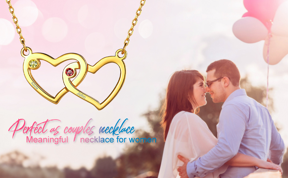 This personalized name necklace for women features two interlocking heart pendants crafted from 925 sterling silver, allowing you to engrave two names and add two birthstones of your loved ones to keep them close to your heart. Elegant, timeless, and lightweight, this customizable jewelry piece makes a meaningful gift for any occasion. The adjustable 45+5 cm chain is hypoallergenic, nickel-free, and safe for sensitive skin.