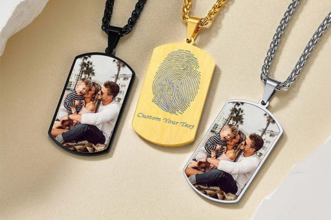 Celebrate Father's Day with our personalized fingerprint & picture necklace. This unique necklace features a stylish dog tag design that can be customized with a fingerprint and picture of your choice, creating a truly personalized keepsake.