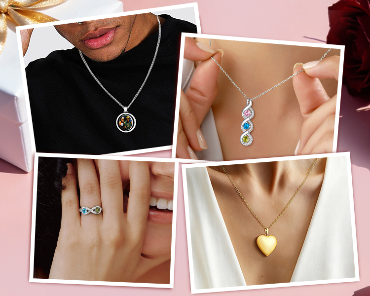 Personalized Sterling Silver Infinity 1-4 Birthstones Necklace for Mom with Kids Names
